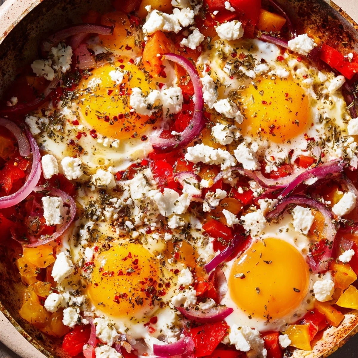 Transform your breakfast routine with this Mediterranean-inspired dish featuring tangy feta cheese and perfectly baked eggs. The combination of sautéed vegetables—tomatoes, bell peppers, red onion, and garlic—creates a flavorful base that pairs beautifully with the creamy cheese. Ready in under 30 minutes, this dish offers protein-rich satisfaction while keeping carbohydrates low. The aromatic blend of oregano, parsley, and optional red pepper flakes adds depth and warmth to every bite.