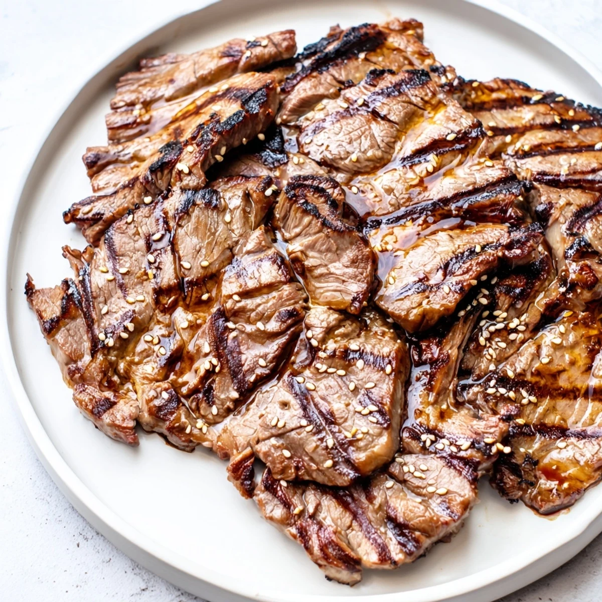 This Japanese-style grilled beef features thinly sliced ribeye or sirloin marinated in a balanced blend of soy sauce, mirin, sake, and aromatic garlic-ginger. The quick high-heat grilling creates perfectly caramelized edges while keeping the meat tender. Serve alongside grilled vegetables like onions, bell peppers, and shiitake mushrooms over steamed rice for a complete meal. The marinade develops deeper flavors if given time to rest, making this ideal for meal prep or quick weeknight dinners.