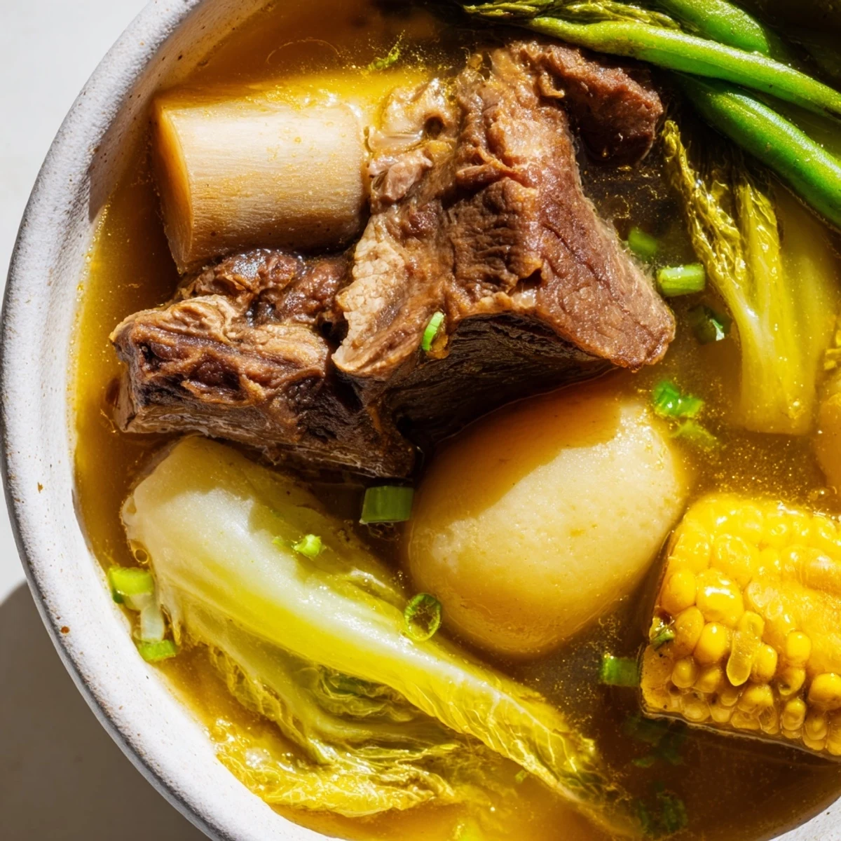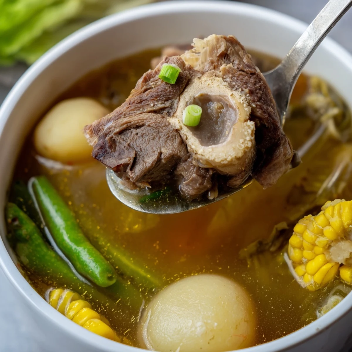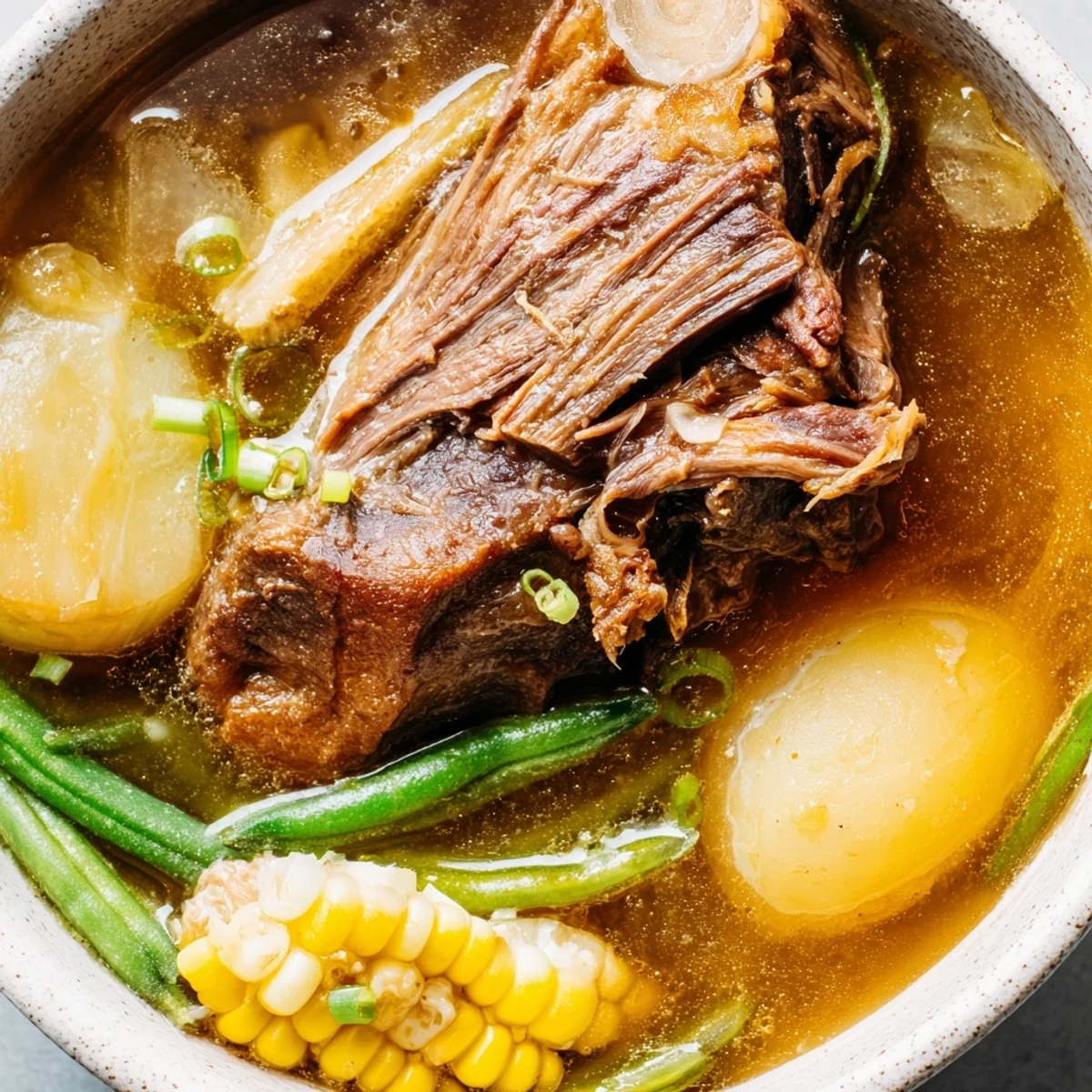 This classic Filipino soup simmers beef shank and marrow bones for hours, creating a deeply flavorful broth. The addition of corn, potatoes, cabbage, and plantains makes it a complete, nourishing meal.