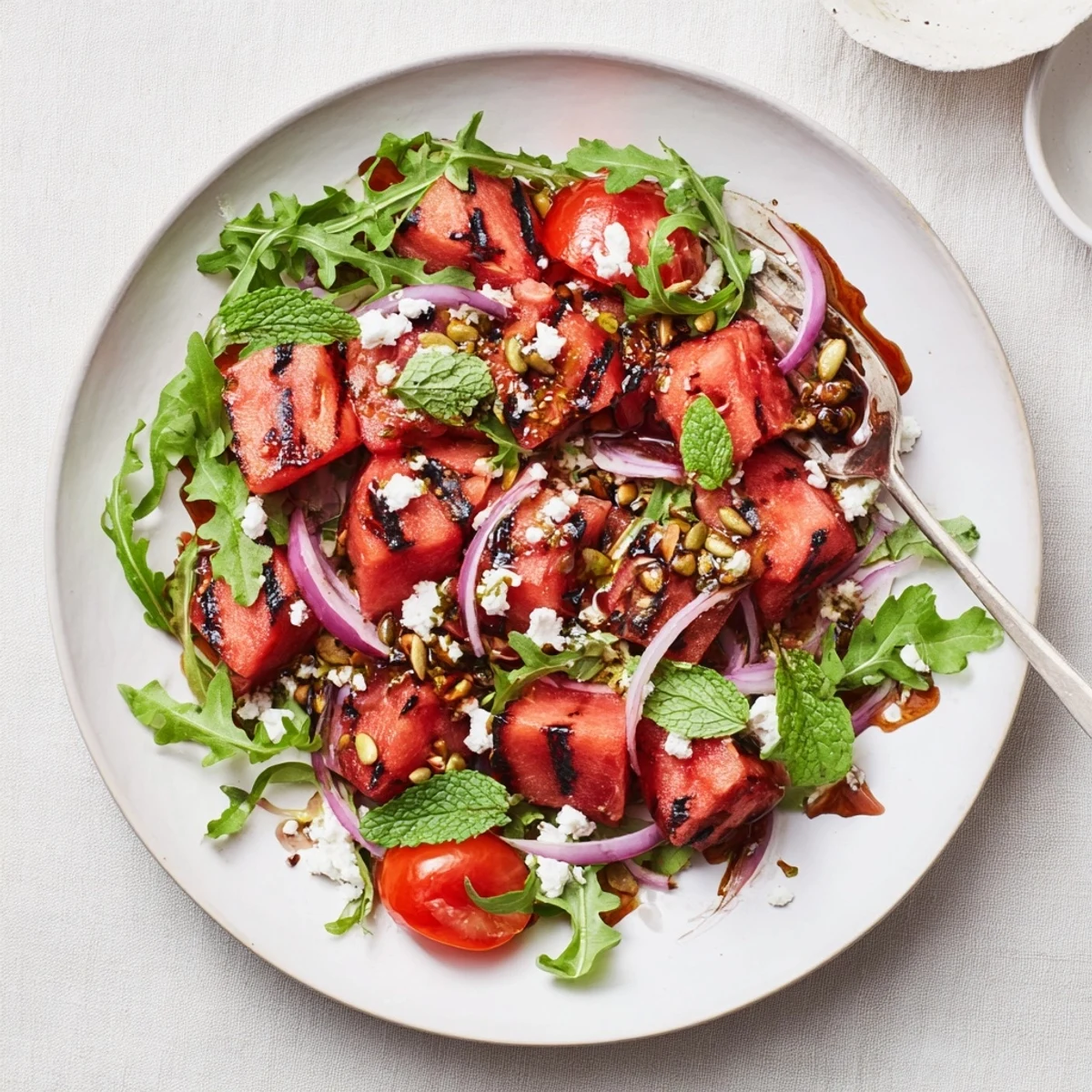 A tangy balsamic glaze dressing ties everything together, while creamy feta adds richness and fresh mint brings brightness. The interplay of temperatures—warm watermelon against cool greens—and textures—crisp, creamy, and juicy—makes each bite interesting.