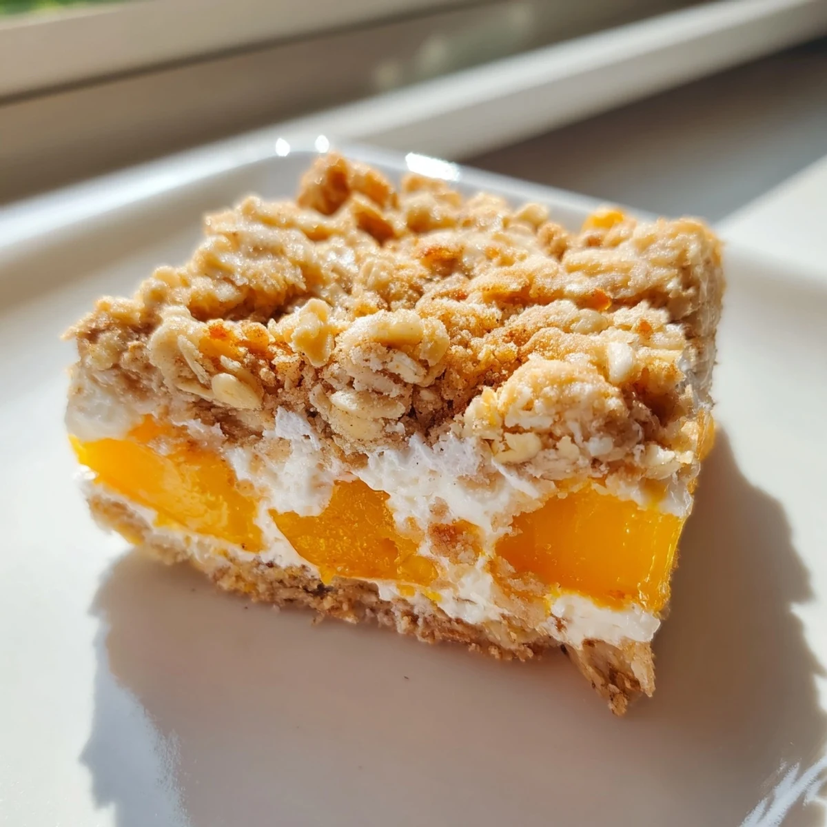 These bars feature three delicious layers starting with a buttery oat crumble base, followed by a smooth cream cheese filling, and topped with juicy sweet peaches. The crumble topping adds delightful texture while the peach layer becomes perfectly jammy during baking.