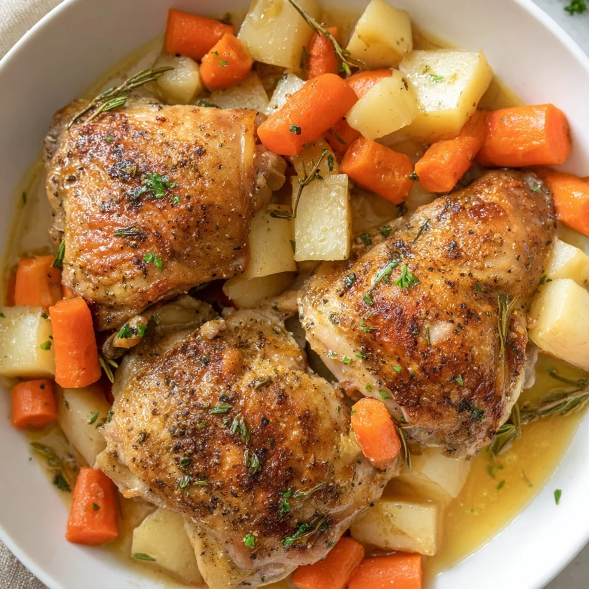 This comforting dish features bone-in chicken thighs seasoned with paprika, thyme, and rosemary, then slow-cooked alongside hearty vegetables. The low, slow cooking method allows flavors to meld beautifully while tenderizing the meat until it falls off the bone.
