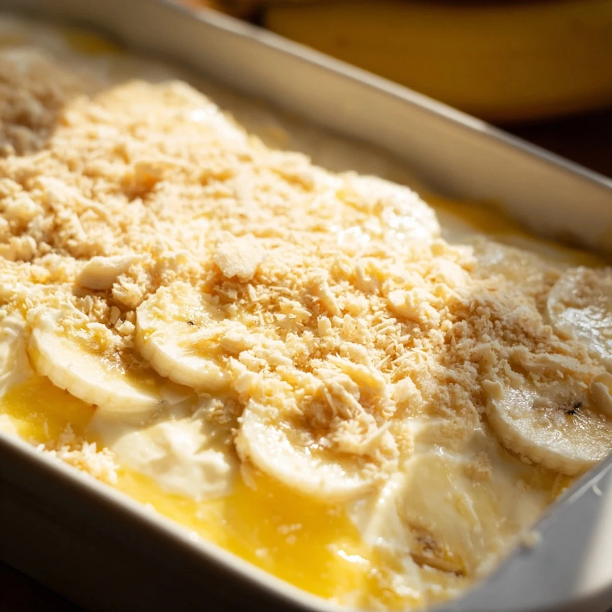 This indulgent Southern dessert combines three beloved treats into one irresistible creation. A creamy cheesecake base forms the foundation, topped with fresh banana slices and silky banana pudding. The magic happens when crushed vanilla wafers and yellow cake mix are sprinkled on top, then drizzled with melted butter and baked until golden brown. The result is a luscious, multi-layered dessert with contrasting textures—creamy, gooey, and perfectly crunchy. Finished with lightly sweetened whipped cream and garnished with extra banana slices, this dump cake serves a crowd and comes together with minimal effort. Perfect for potlucks, family gatherings, or anytime you need a comforting Southern classic.